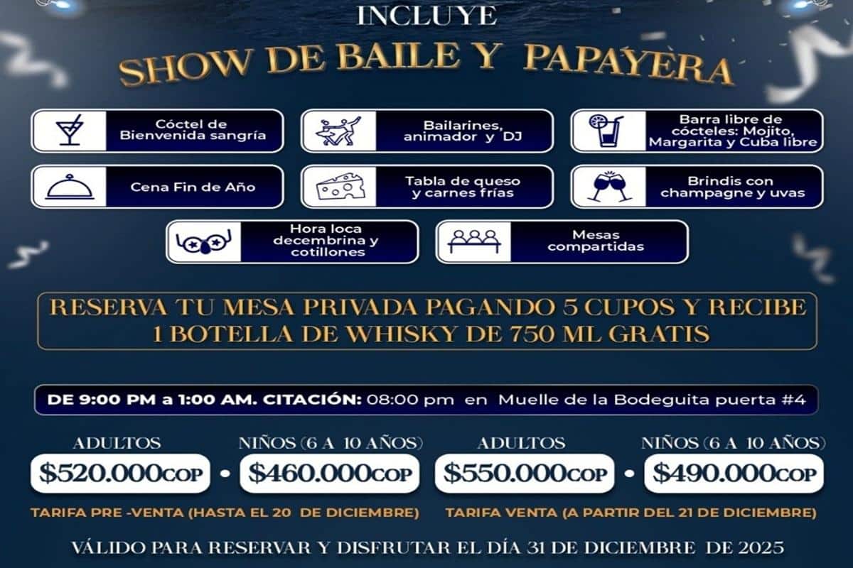 La Cena San Silvestre en la Bahía de Cartagena es más que un evento: es una tradición que reúne a locales y visitantes para vivir una experiencia única bajo las estrellas. Con el sonido del mar de fondo, la música, el brindis de medianoche y la emoción del nuevo año, se crea un ambiente cargado de energía positiva y felicidad.