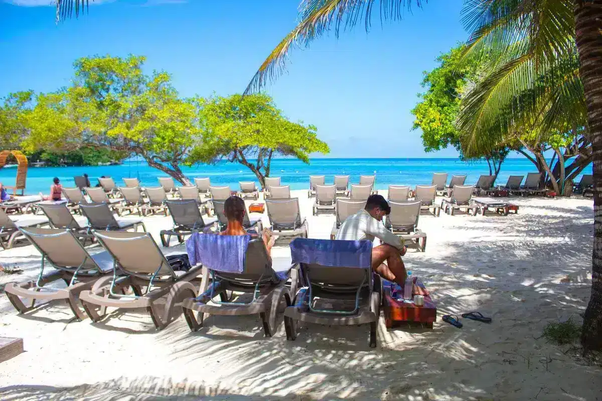 Podrás elegir entre relajarte en cómodas asoleadoras frente al mar, refrescarte en el agua o disfrutar de las zonas de descanso bajo parasoles y palmeras.